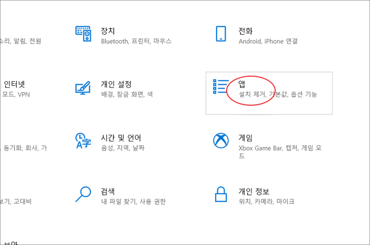 ▼ 두 번째는 윈도우 기본 브라우저 지정을 엣지가 아닌 다른 것으로 변경하는 방법입니다. 기본 브라우저 설정 변경을 위해 설정 > 앱 메뉴를 클릭합니다.