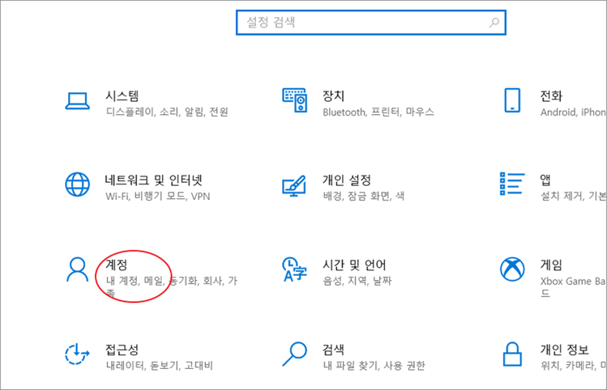 ▼ 윈도우 업데이트 이후에 자동으로 브라우저가 열리는 것을 방지하기 위한 설정을 변경해 보겠습니다. 설정 > 계정 메뉴를 클릭해서 상세 화면으로 이동합니다.