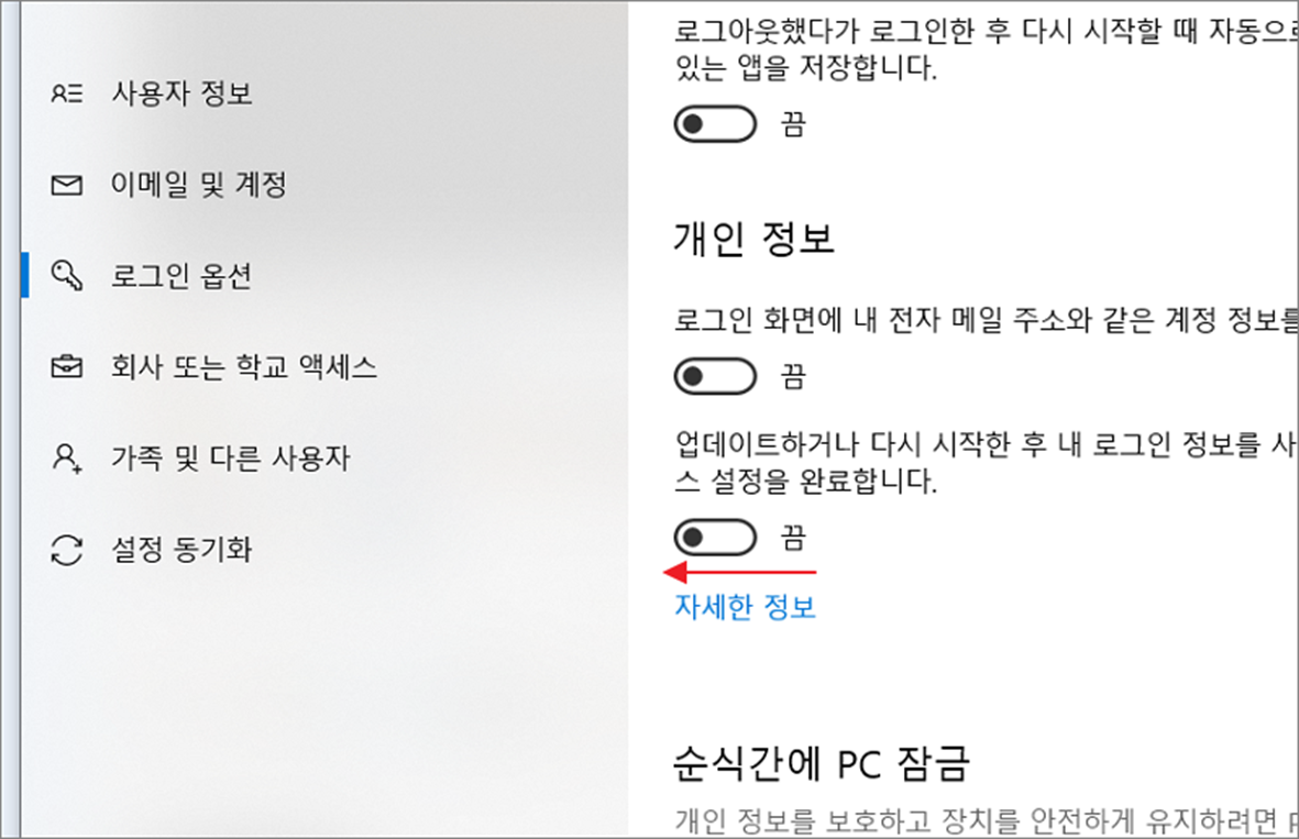 ▼ 화면 아래 “개인 정보” 항목으로 이동해서 “업데이트하거나 다시 시작한 후 내 로그인 정보를…” 옵션을 끔으로 변경합니다. 해당 부분을 전환하면 업데이트 이후 브라우저를 자동 실행하지는 않을 겁니다.