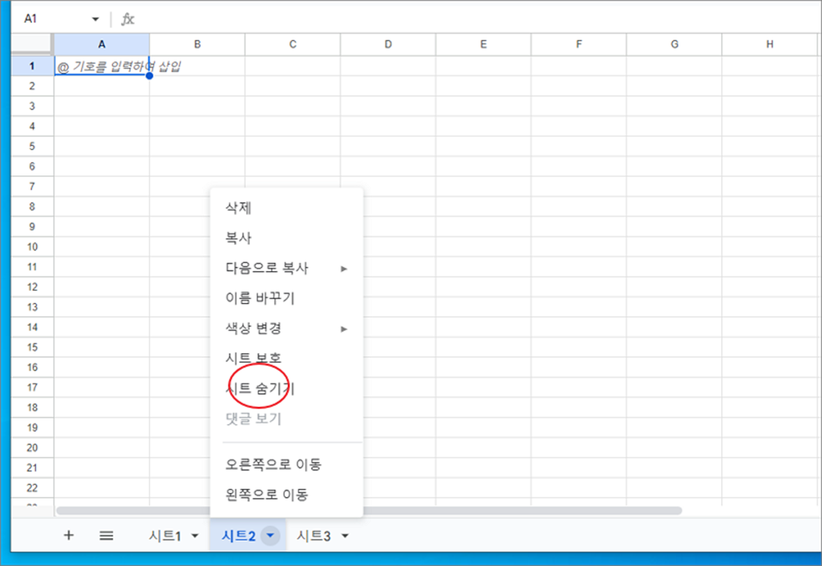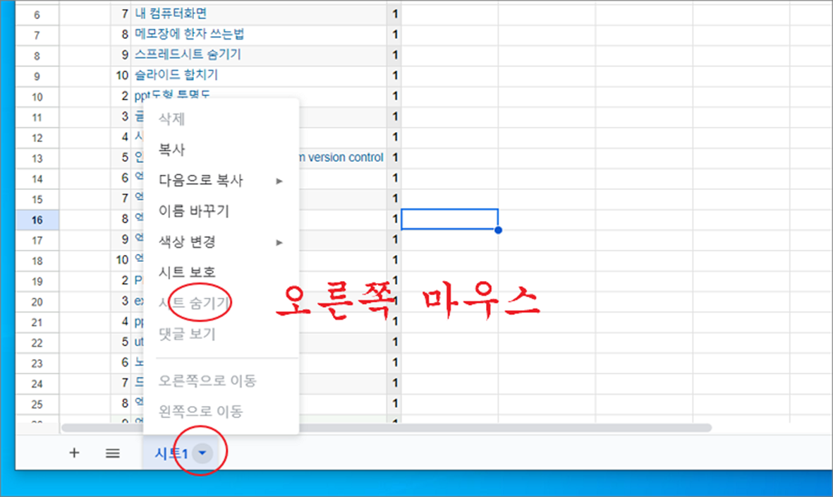 ▼ 시트 숨기기는 간단합니다. 숨기고 싶은 시트에 오른쪽 마우스 클릭하고 “시트 숨기기” 메뉴를 클릭합니다. 하지만 스프레드시트에 시트가 하나 일때는 “시트 숨기기” 메뉴는 비활성화가 됩니다. 숨길 시트가 없기 때문입니다.