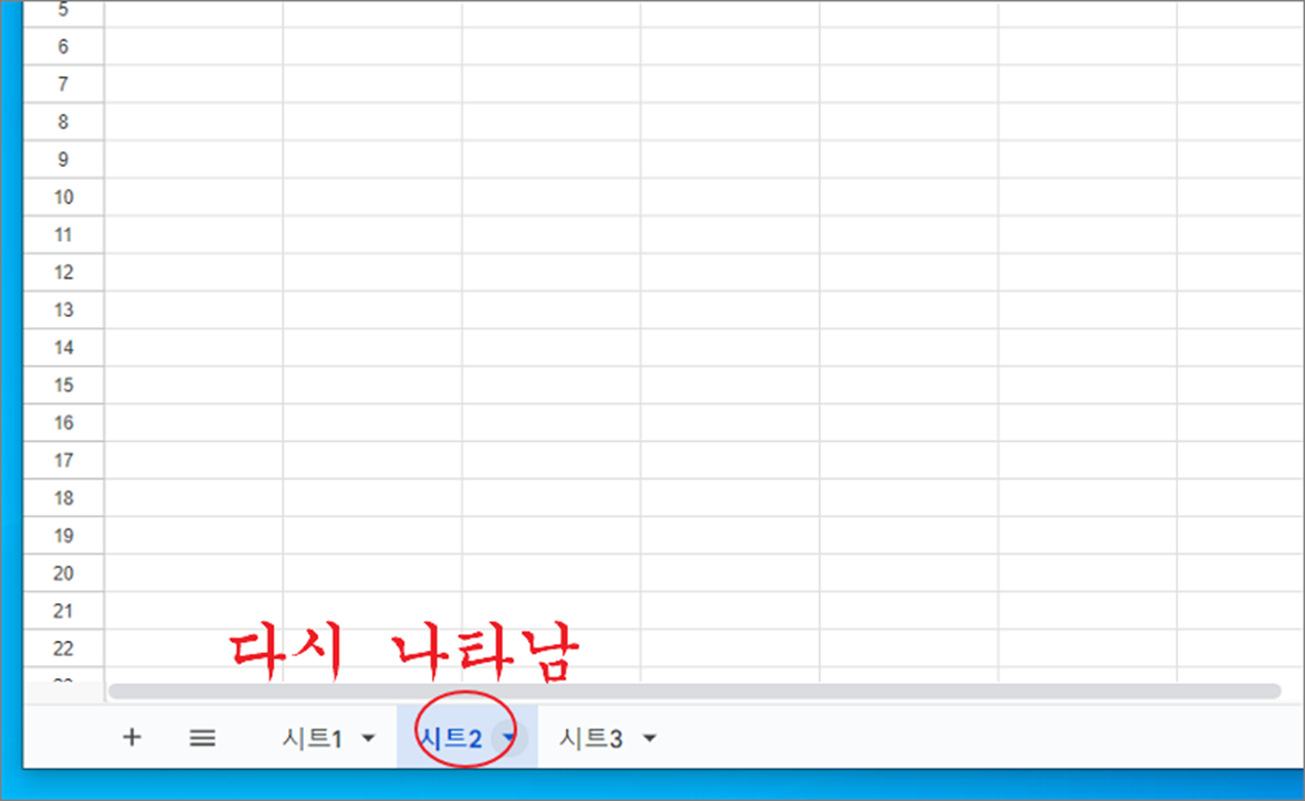 ▼ 회색으로 처리된 시트명을 클릭해 보세요. 화면에 다시 숨겨진 시트가 나타날 겁니다.