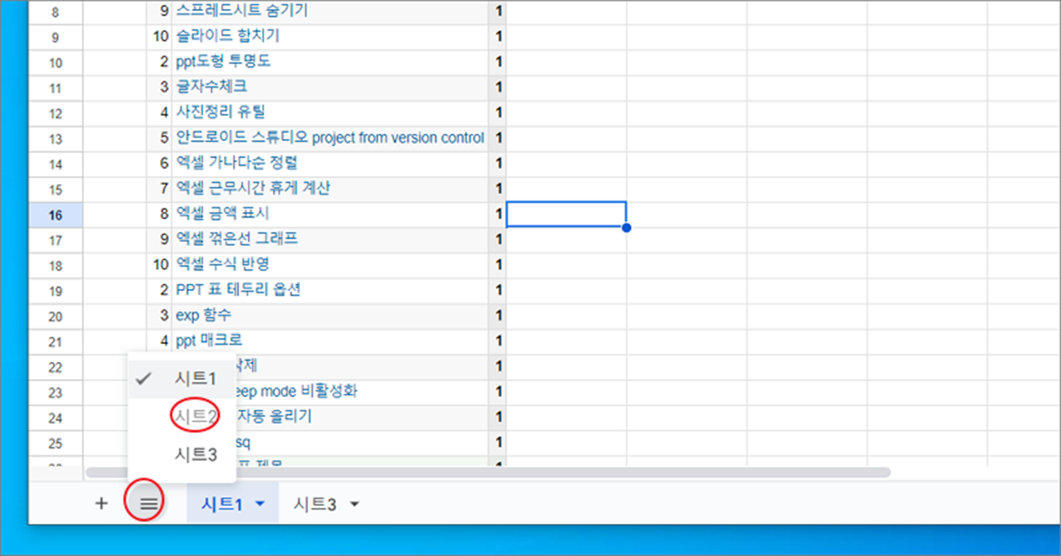▼ 다시 시트를 표시하고 싶다면 어떻게 해야 할까요? 시트 추가 “+” 버튼 바로 옆에 “더보기” 메뉴가 있습니다. 하위에는 모든 시트들이 목록으로 표시되는데, 숨긴 시트명이 회색입니다. 해당 시트는 숨겼다는 의미입니다.