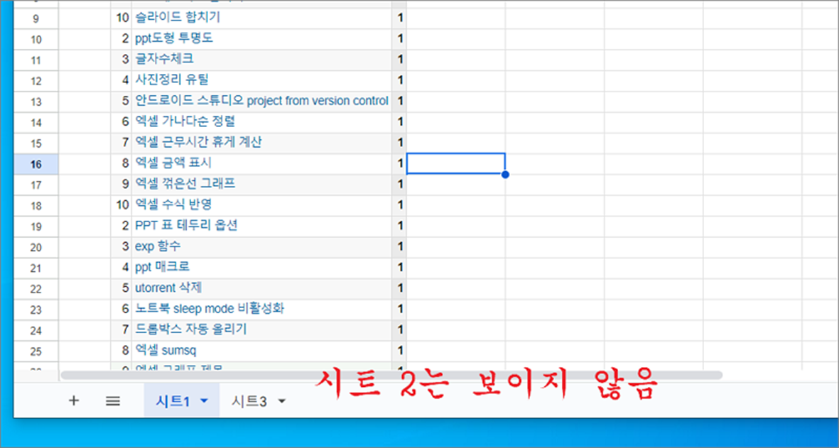 ▼ 현재 세개의 시트 중에서 “시트2” 를 숨겼더니 보이지 않습니다.