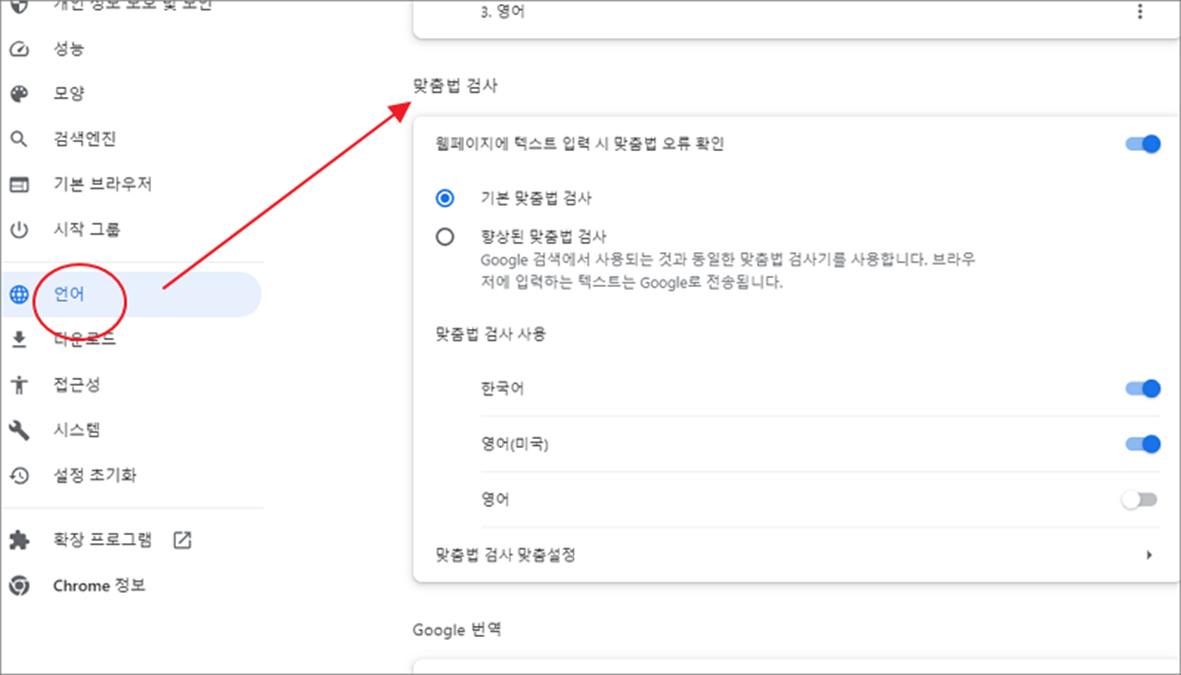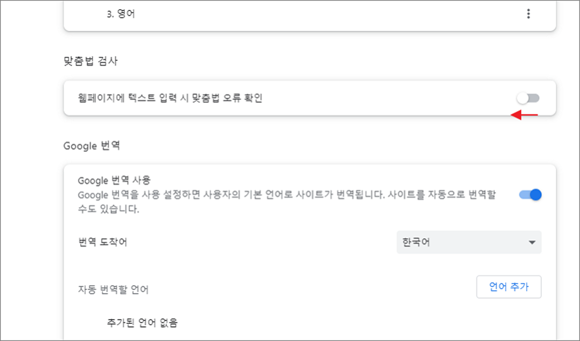 ▼ 언어 설정 화면에서 맞춤법 검사 항목을 비활성화로 변경합니다.