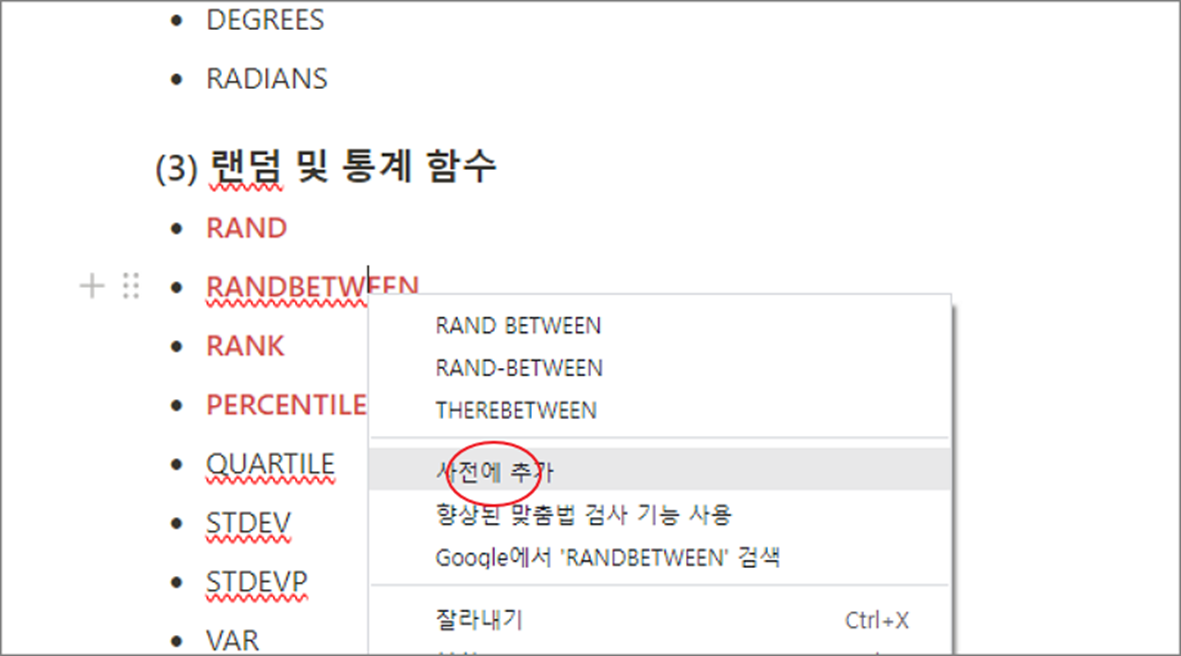 ▼ 세 번째는 맞춤법 검사 전체를 해제하는 것이 아닌 특정 단어만 사전에 추가해서 빨간 줄을 제거하는 방법입니다. 빨간 줄이 있는 단어에 커서를 두고 오른쪽 마우스 > 사전에 추가 메뉴를 선택합니다.