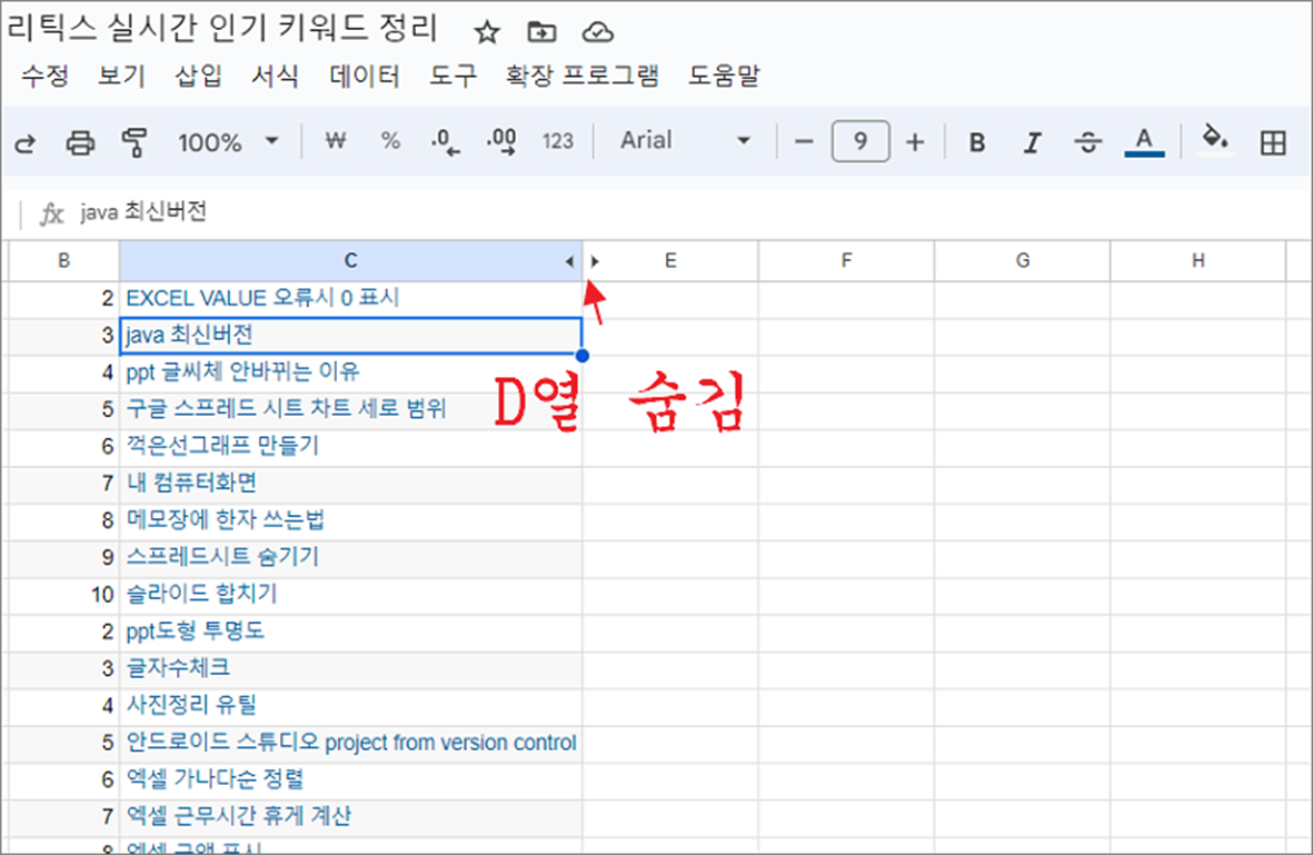 ▼ 그림처럼 이전에 숨긴 D 열이 다시 나타났습니다.