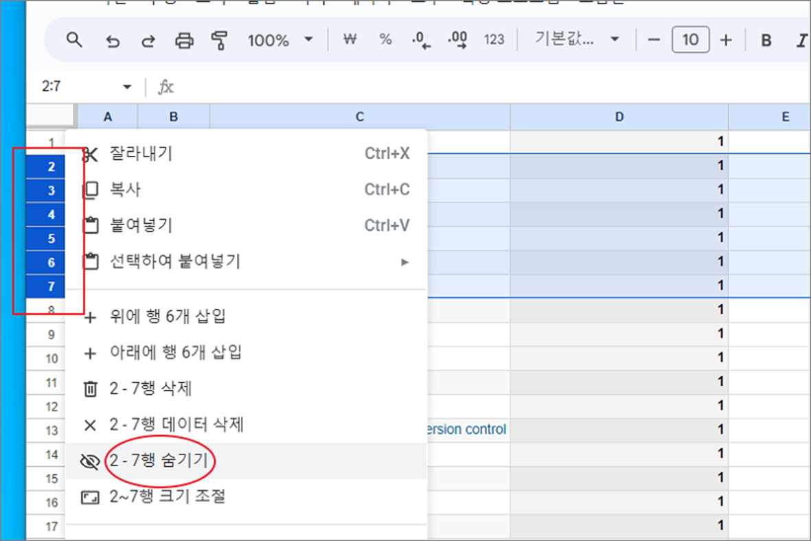 ▼ 이번에는 여러 행/열을 한 번에 숨기거나 해제해 보겠습니다. 먼저 탭을 이용해서 숨기고 싶은 행을 모두 선택합니다. 그리고 오른쪽 마우스를 눌러 “[행번호] 행 숨기기” 메뉴를 찾아 선택합니다.