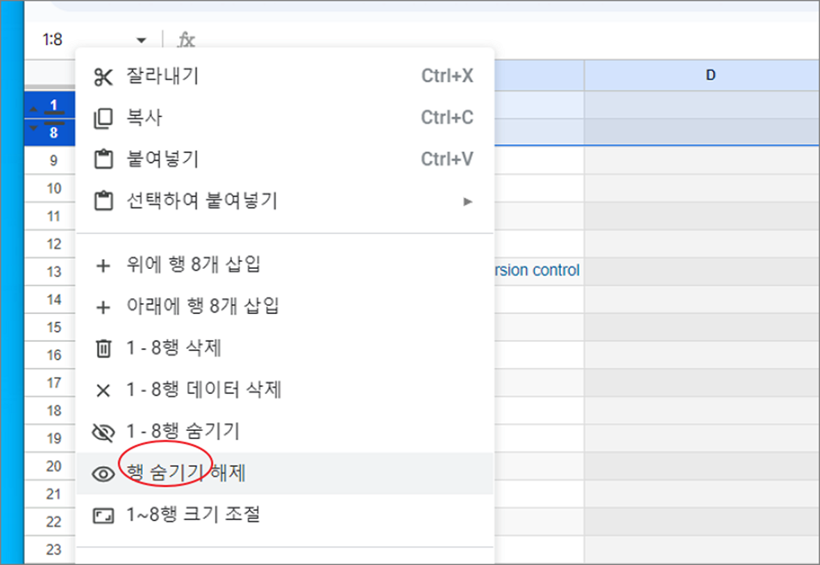 ▼ 오른쪽 마우스를 눌러 “행 숨기기 해제” 메뉴를 찾아 선택합니다.