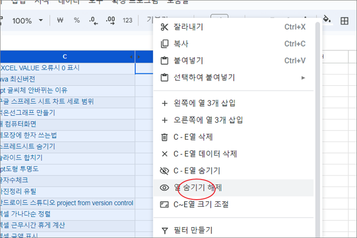 ▼ 오른쪽 마우스를 눌러 “열 숨기기 해제” 메뉴를 찾아 클릭합니다.