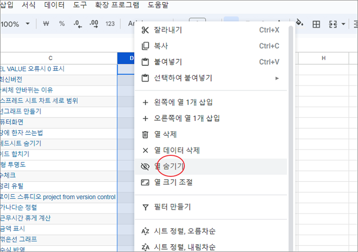 ▼ 또는 행이나 열을 선택한 성태에서 오른쪽 마우스를 누릅니다. 화면에 뜬 빠른 실행 메뉴 목록에서 “열 숨기기” 를 찾아서 선택합니다.