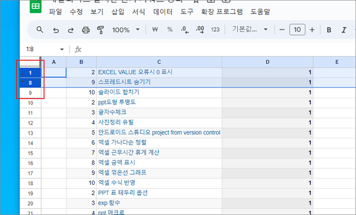 ▼ 결과는 다음과 같습니다. 이전에 숨겼던 행 전체를 한 번에 찾았습니다.