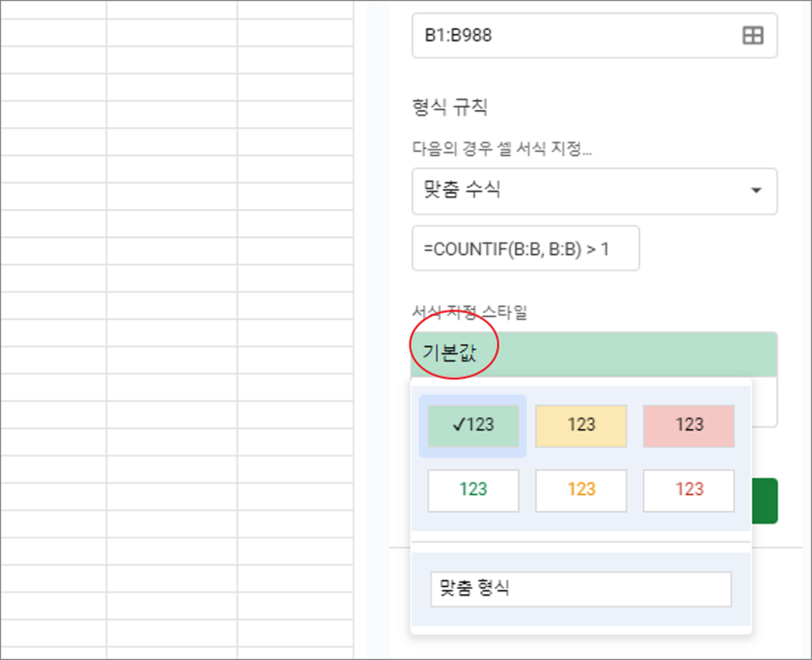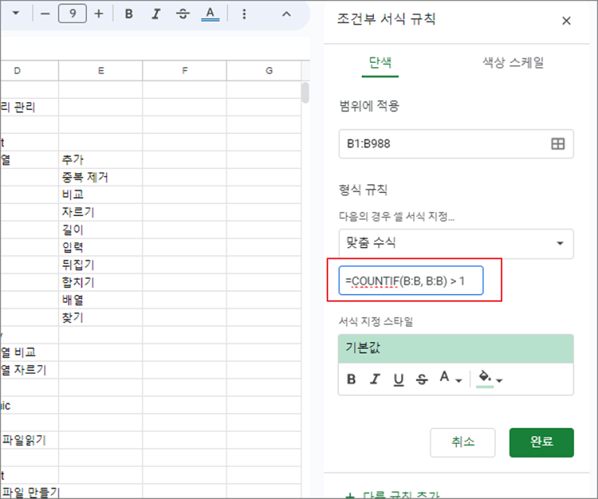 ▼ “맞춤 수식” 아래에 수식을 입력합니다. 함수는 COUNTIF 입니다. COUNTIF 함수는 Google 스프레드시트에서 사용되는 유용한 함수 중 하나로, 특정 조건을 만족하는 셀의 개수를 세는 데 사용합니다. COUNTIF 함수의 구문은 다음과 같습니다: