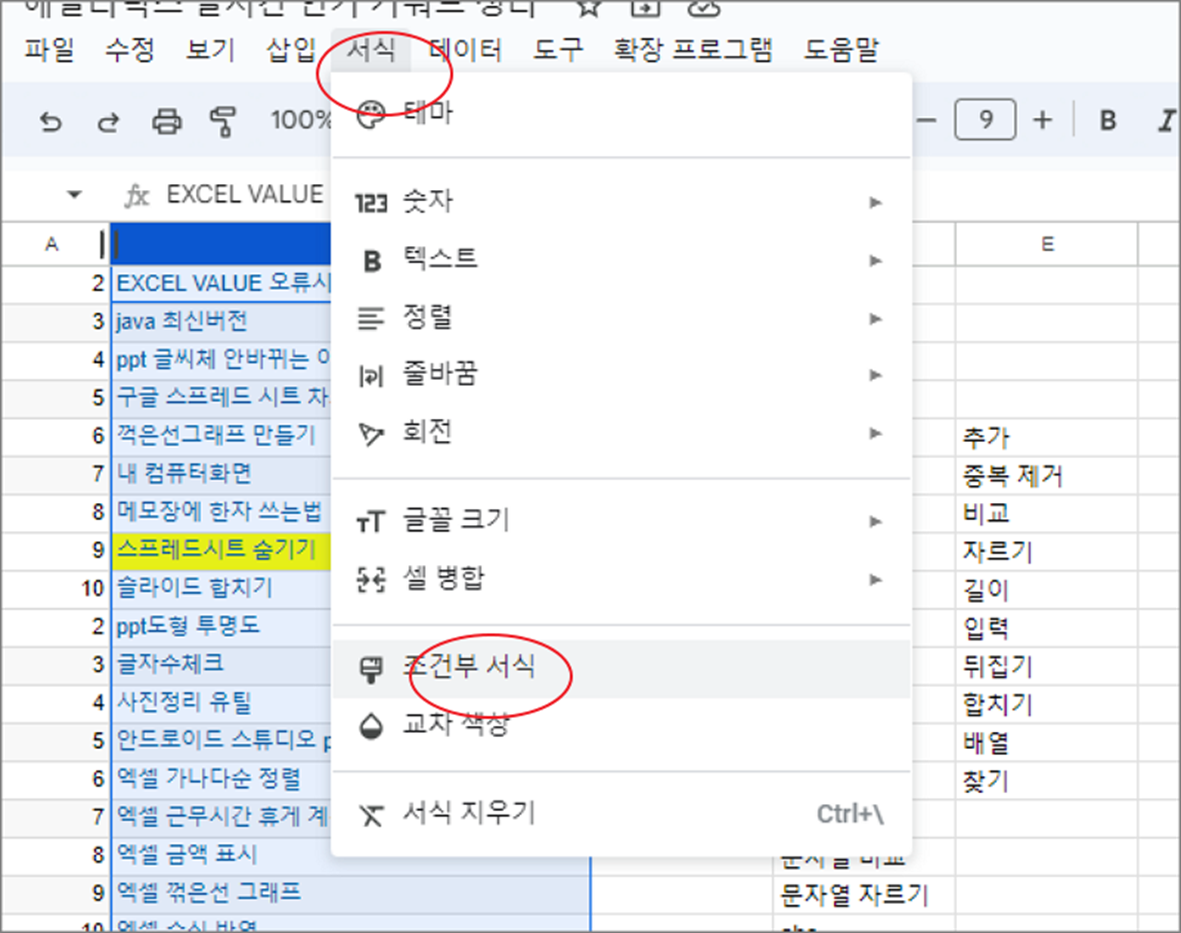 ▼ 이제부터 조건부 서식을 이용해서 중복 데이터를 표시해 보겠습니다. 중복 데이터를 표시하고 싶은 영역을 먼저 선택해도 되고 하지 않아도 상관없습니다. 조건부 서식에서 수식을 입력할 때 영역을 지정할 것이기 때문입니다. 상단 메뉴 서식 > 조건부 서식 를 선택합니다.