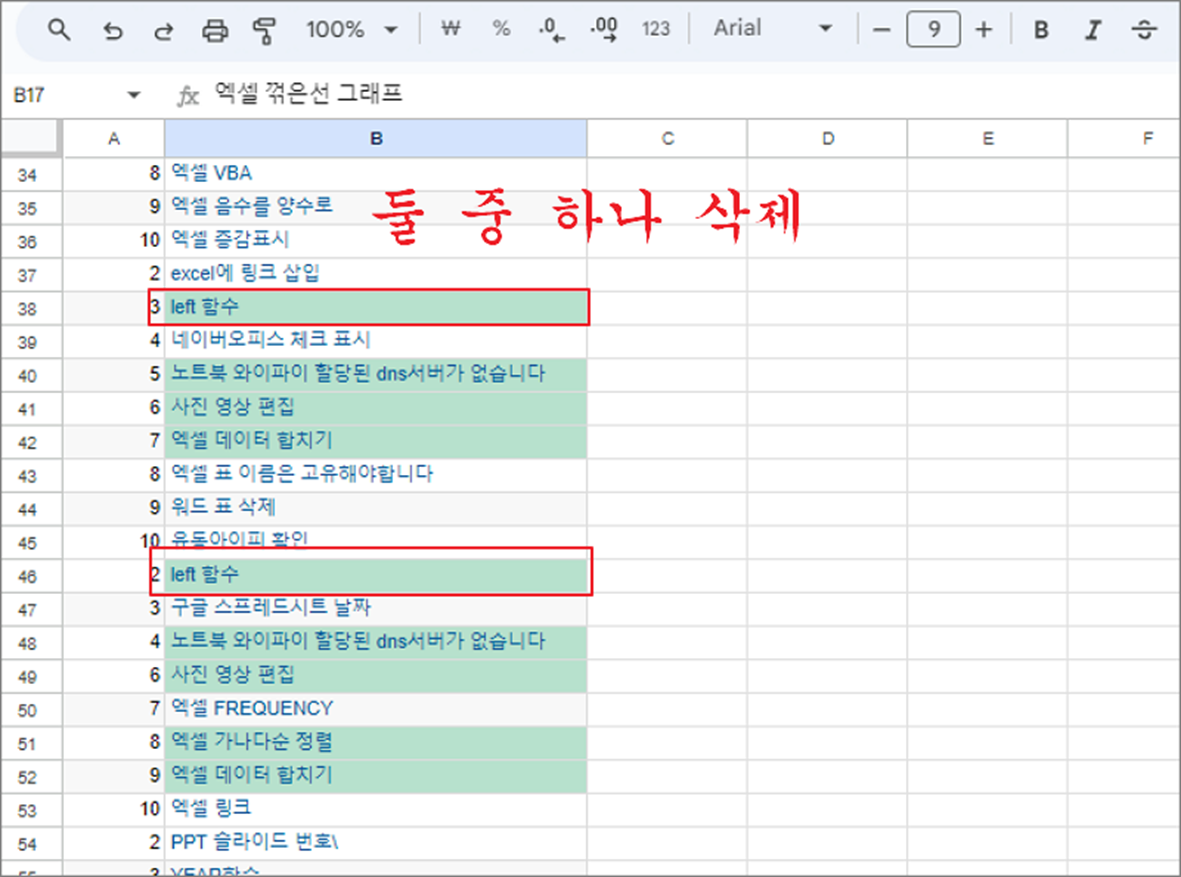 ▼ 조건부 서식을 적용한 결과는 다음과 같습니다. B 열 전체에서 두 개 이상일 경우 사용자가 지정한 서식으로 표시합니다. 이중 하나를 삭제해 보세요.