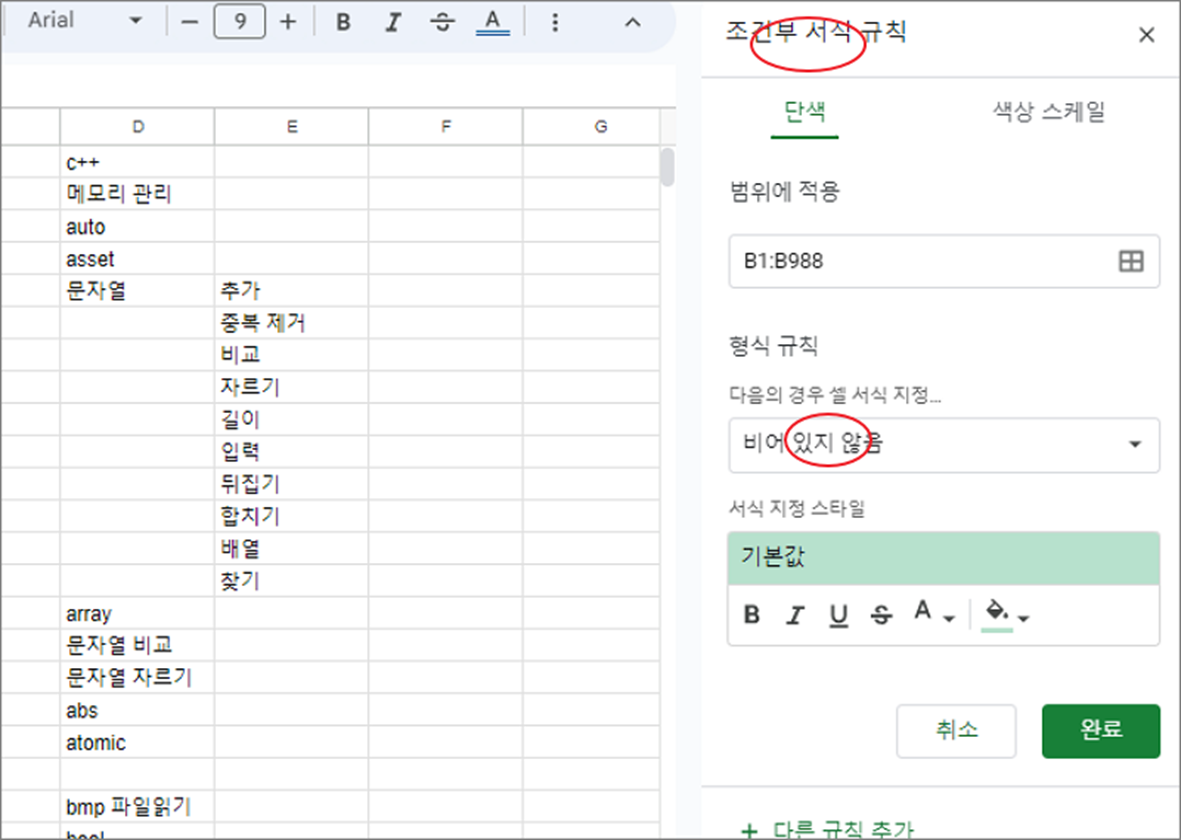 ▼ 오른쪽 사이드에 “조건부 서식 규칙” 화면이 뜨면 “단색” 탭으로 이동합니다. 다음 “형식 규칙” 항목으로 가서 “비어 있지 않음” 옵션을 클릭합니다.