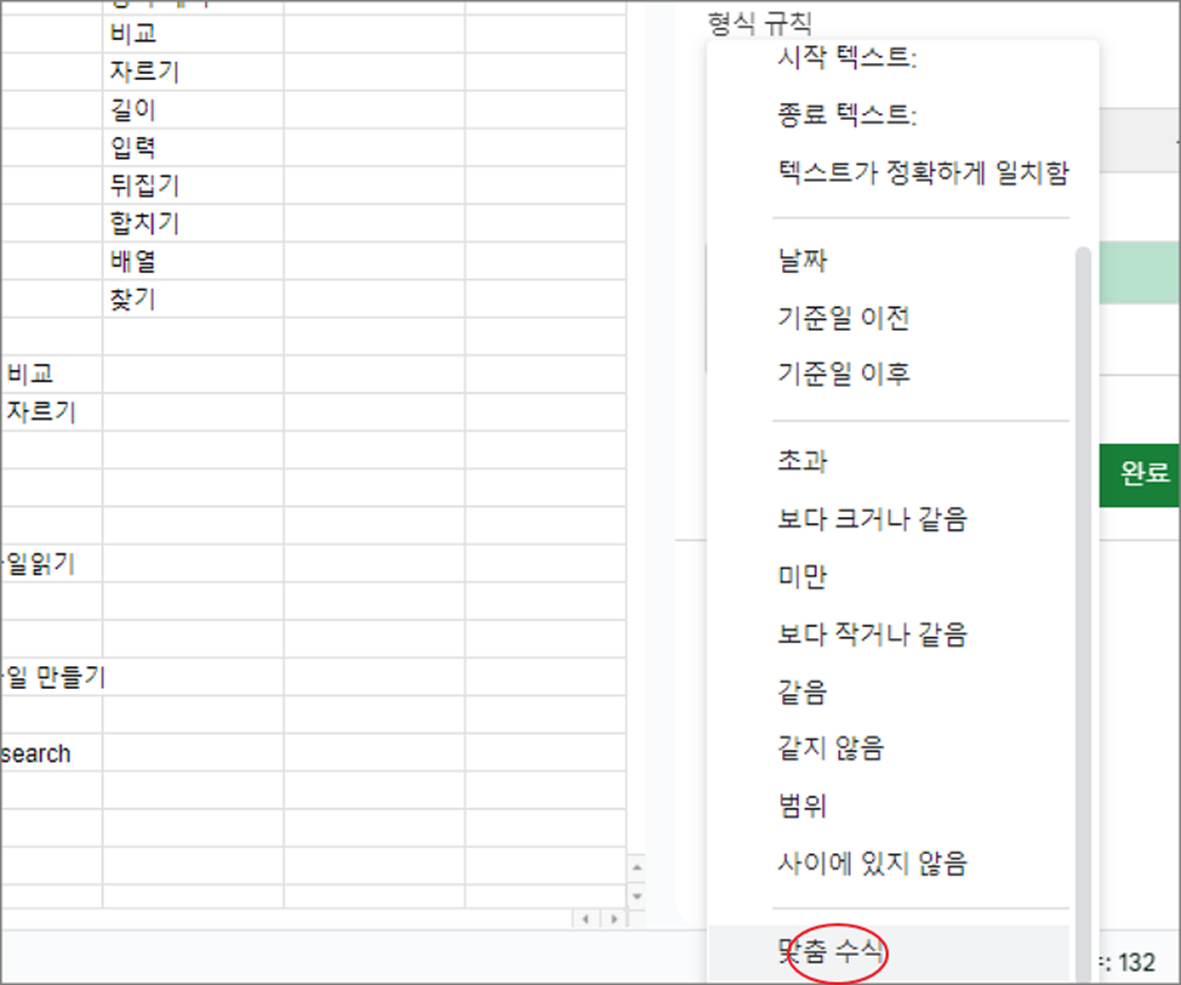 ▼ 형식 규칙 옵션 목록에서 제일 아래에 있는 “맞춤 수식” 을 선택합니다. 이전에 만들어진 조건이 아닌 사용자가 직접 수식을 만들어 조건으로 적용할 수 있는 기능이기 때문입니다.