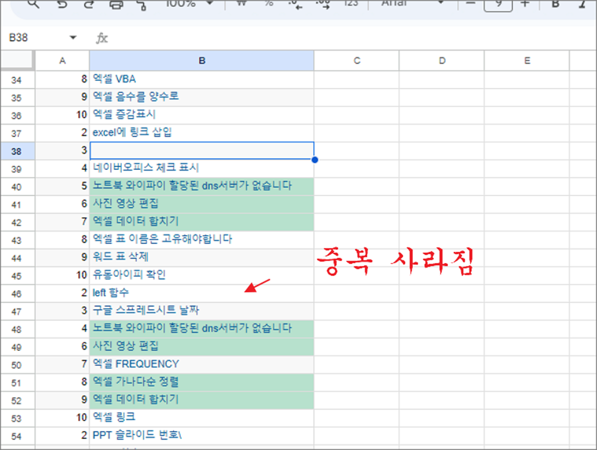 ▼ 중복 데이터를 삭제하는 순간 B 열 전체를 다시 계산해서 화면에 뿌려 줍니다. 중복의 결과를 바로바로 표시하는 것이죠.