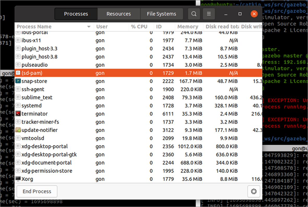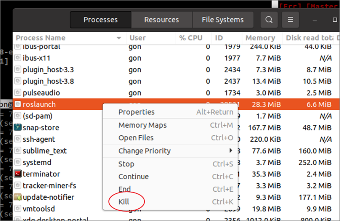 ▼ 시스템 모니터(System Monitor) 화면이 뜨면 Processes 탭으로 이동합니다. 종료하고 싶은 프로세스를 선택하고 오른쪽 마우스 > Kill 메뉴를 클릭합니다.