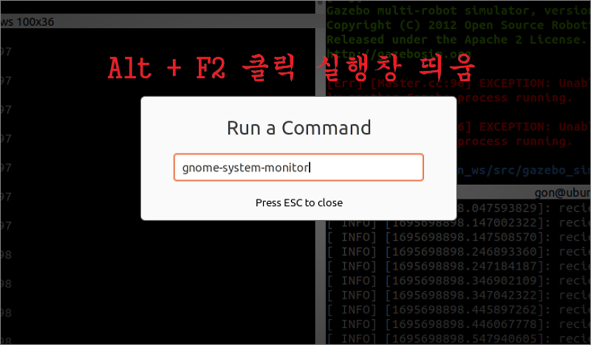 ▼ 두 번째 시스템 모니터를 띄우는 방법은 실행창에서 gnome-system-monitor 명령을 실행하는 것입니다. Alt + F2 단축키를 눌러 실행창을 띄운 후 명령어를 넣고 Enter 를 클릭합니다.