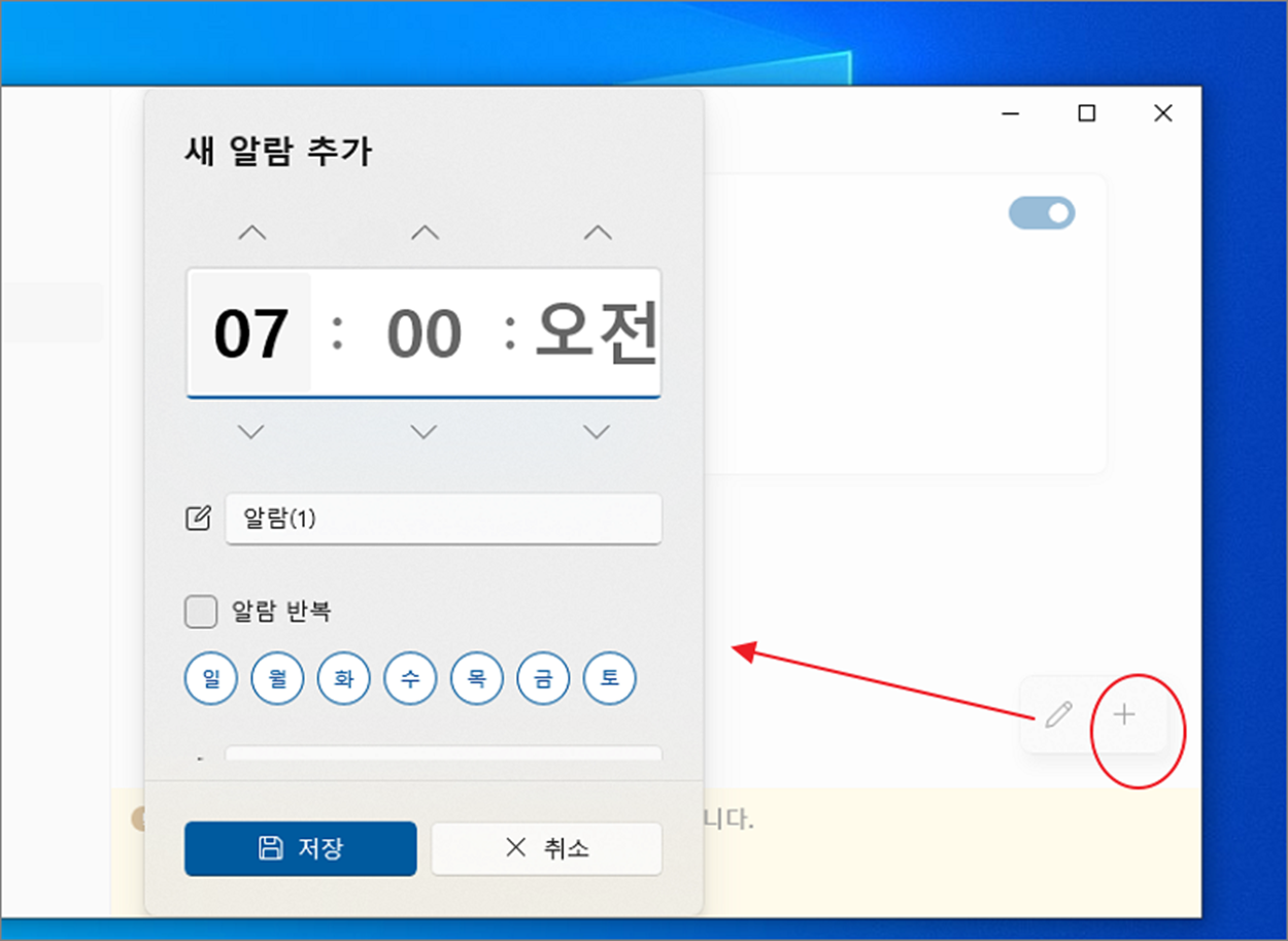 ▼ 다음은 새로운 알람을 추가해 보겠습니다. 알람 오른쪽 하단에 “+” 버튼을 클릭해서 “새 알람 추가” 창을 띄웁니다. 이전처럼 알람에 필요한 정보를 입력하고 “저장” 버튼을 클릭합니다.