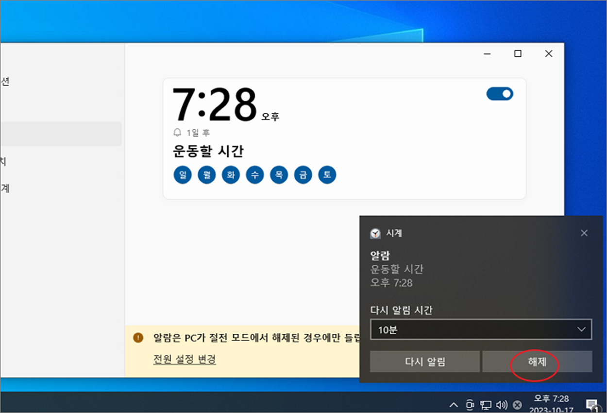 ▼ 이렇게 추가한 알람 시간이 되면 오른쪽 하단 알림 메시지가 뜹니다. 사용자가 “해제” 를 누르면 알람은 끝나지만 “다시 알림” 버튼을 클릭하면 설정한 간격에 맞게 한번 더 알람이 발생합니다.