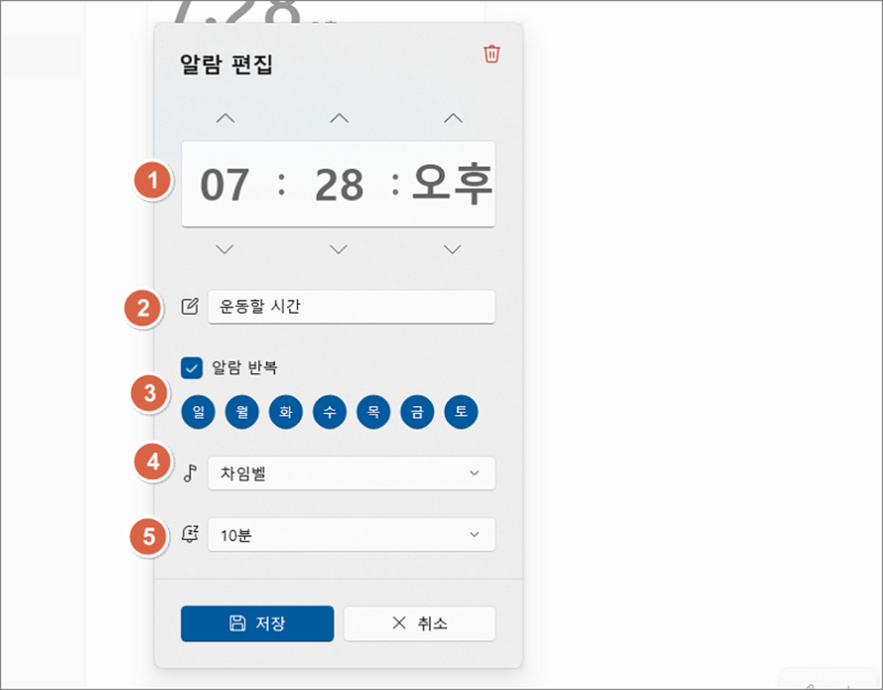 ▼ 화면에 뜬 알람 편집 창에서 시간과 메시지, 알람을 반복할 요일, 벨소리 종류, 반복 간격을 지정하고 “저장” 버튼을 눌러 알람을 생성합니다.