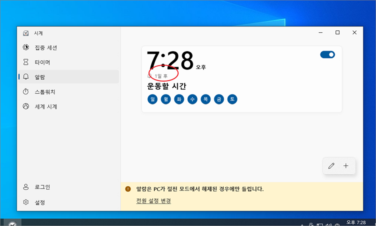 ▼ “해제” 버튼 클릭 이후 “알람” 설정창을 보면 “1일 후” 로 바뀐 것을 볼 수 있습니다.