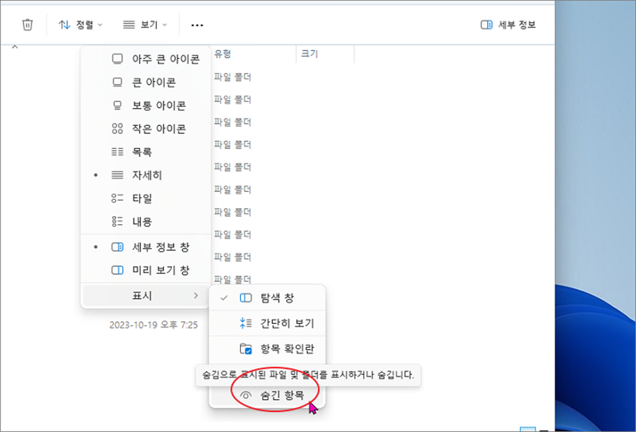 ▼ 표시 하위 메뉴에 숨긴 항목 을 체크해 보세요. 화면에 숨김 파일 이나 폴더가 나타날 겁니다.
