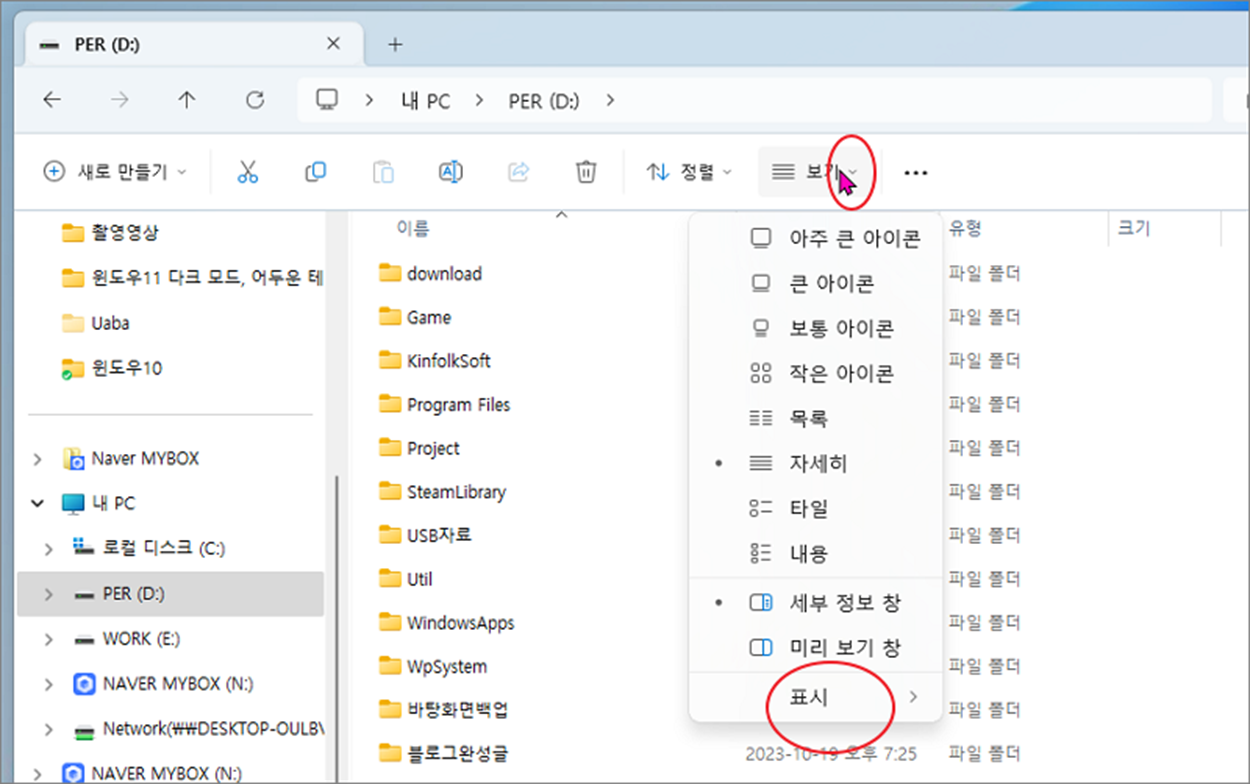 ▼ 다음은 숨김 파일을 다시 탐색기에 표시해 보겠습니다. 파일 탐색기를 띄운 후 상단에 있는 메뉴 중 [보기] 옆 화살표를 클릭해서 메뉴를 확장합니다. 메뉴 목록에서 제일 아래에 있는 [표시] 를 클릭합니다.