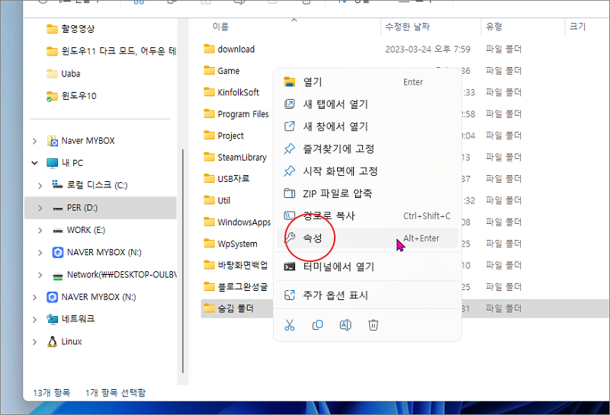 ▼ 마지막으로 숨김 적용이 된 파일을 다시 숨지 않도록 설정을 이전으로 돌려보겠습니다. 이전과 동일하게 파일을 선택하고 속성 창을 띄웁니다.