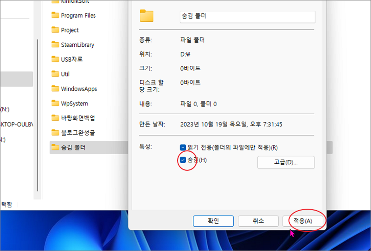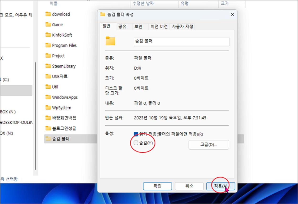 ▼ 폴더 속성 창에서 특성 항목에 체크되어 있는 숨김 옵션을 해제합니다. 그리고 적용 버튼을 눌러 숨김 해제 합니다.