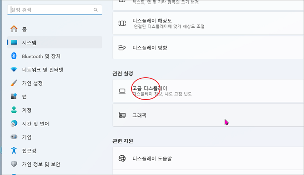 ▼ 오른쪽 화면에서 아래로 내려가시면 [관련 설정] 에 [고급 디스플레이] 메뉴가 있습니다. 클릭해서 고급 디스플레이 설정 화면으로 이동합니다.