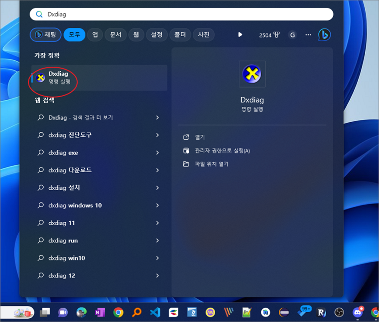 ▼ 세 번째 방법은 DirectX 진단 도구를 이용하는 것입니다. 진단 도구 실행을 위해 검색란에 Dxdiag 를 입력합니다. d 는 소문자가 아닌 대문자 D 를 입력해서 검색에서 나타납니다. 그리고 검색된 dxdiag 를 클릭해서 실행합니다.