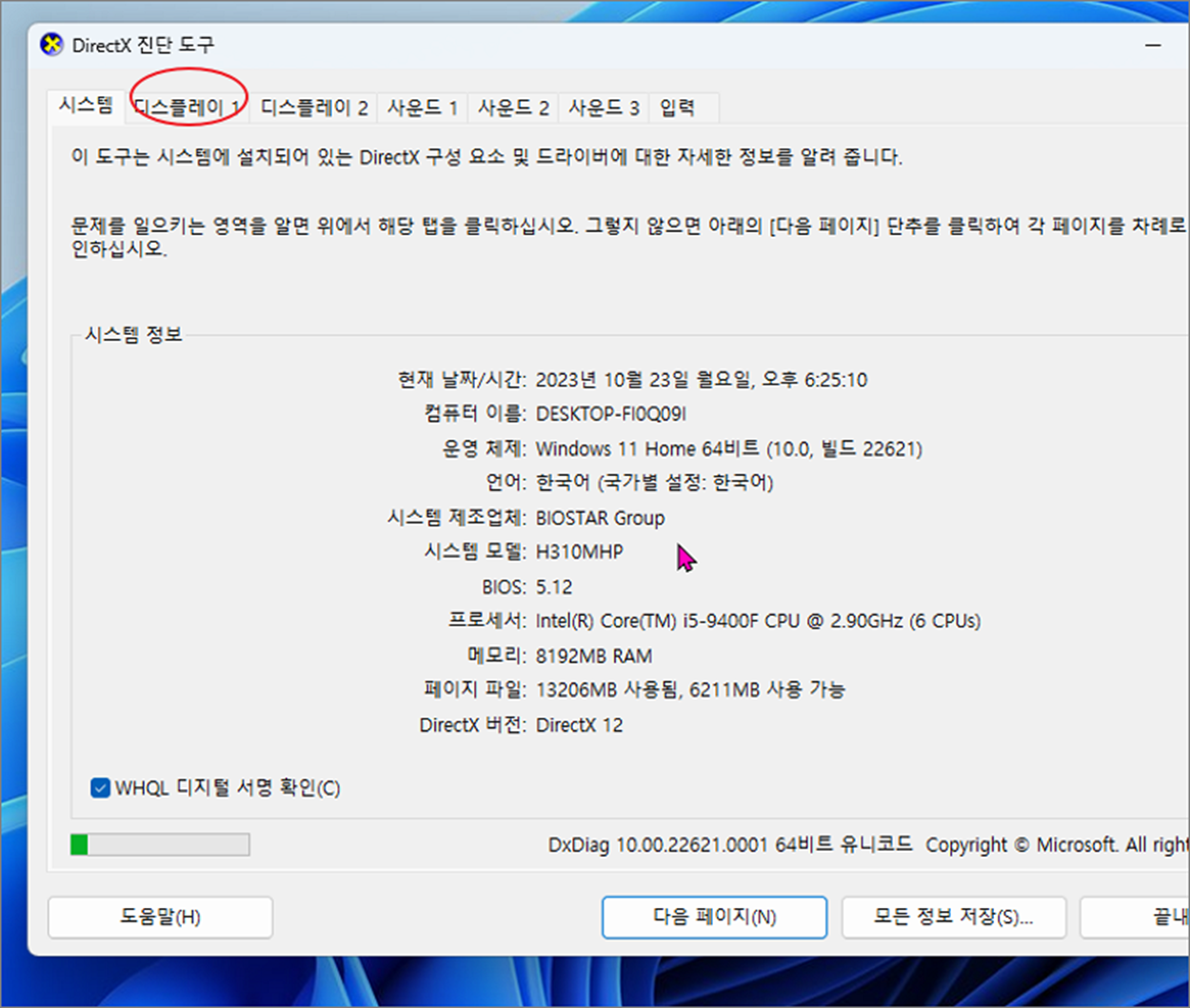 ▼ DirectX 진단 도구 팝업창이 뜨면 [디스플레이] 탭으로 이동합니다.