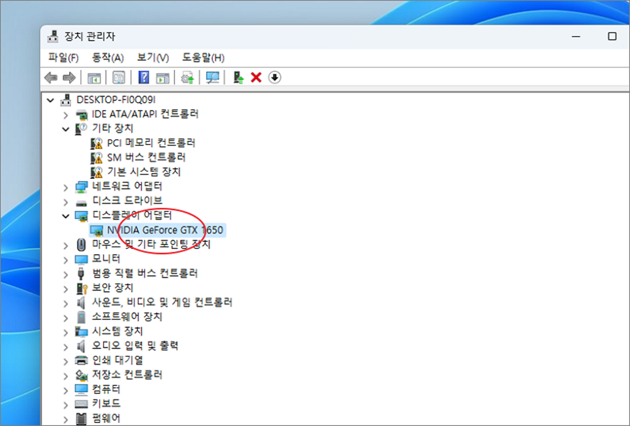▼ 시스템 정보 페이지가 뜨면 왼쪽 메뉴 목록에서 [장치 관리자]를 선택합니다. 장치 관리자에서 그래픽 카드 정보는 [디스플레이 어댑터] 안에 있습니다. 만약 그래픽 드라이버가 제대로 설치되어 있지 않다면 이 부분이 ? 로 표시됩니다.