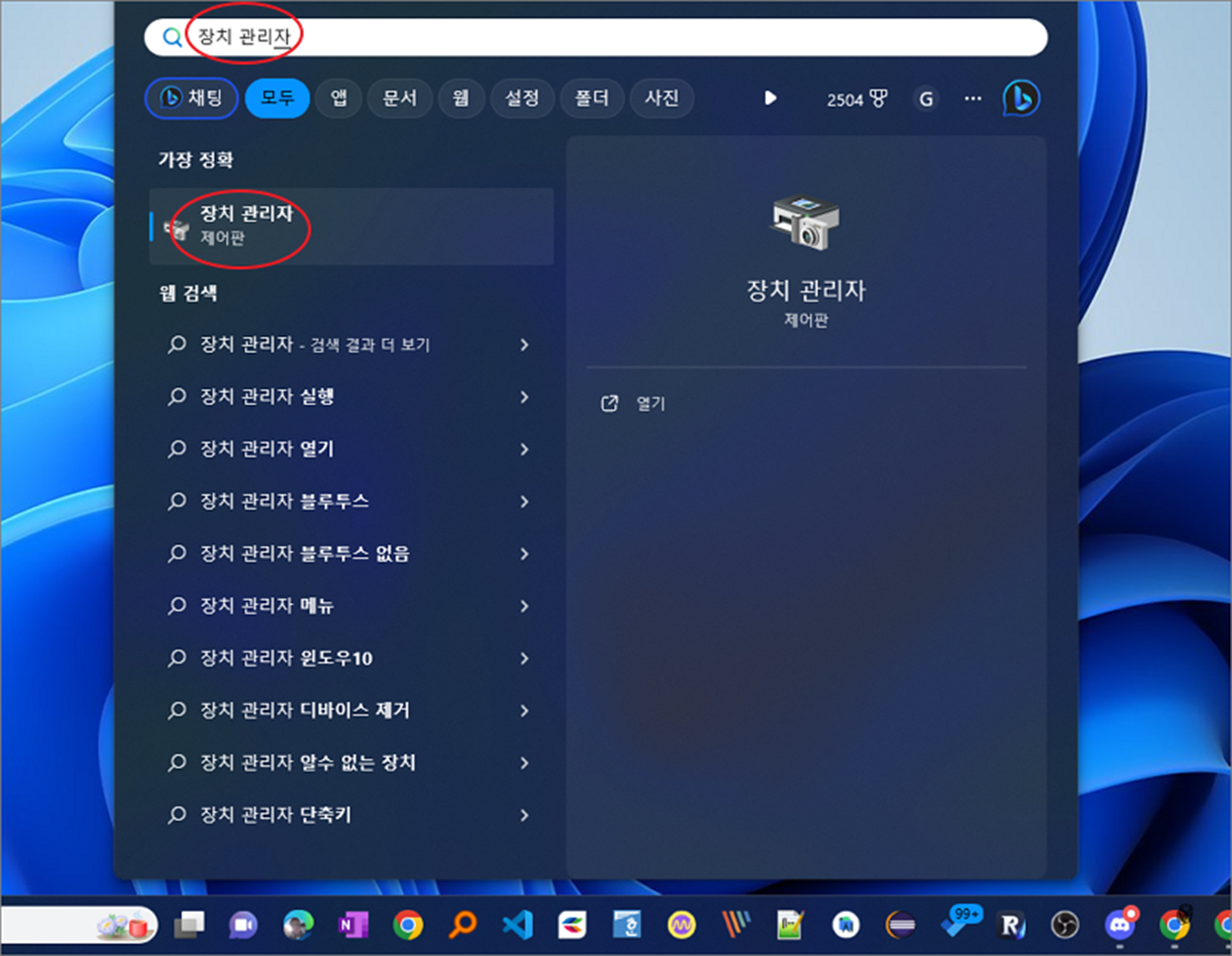 ▼ 첫 번째는 장치 관리자에서 찾아보는 방법입니다. 장치 관리자에는 컴퓨터를 구성하는 모든 기기 정보를 볼 수 있는 곳입니다. 검색 기능을 사용해서 [장치 관리자] 를 찾아 실행합니다.