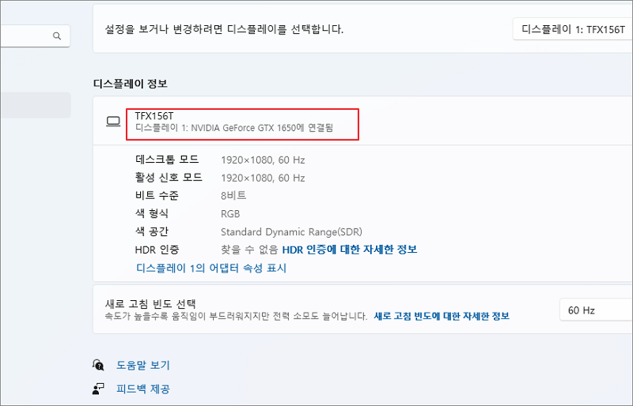 ▼ 고급 디스플레이 설정 상세 화면으로 이동하면 다양한 정보를 확인할 수 있습니다. 그 중에서 디스플레이 정보 상단에 그래픽 카드 정보가 나옵니다.