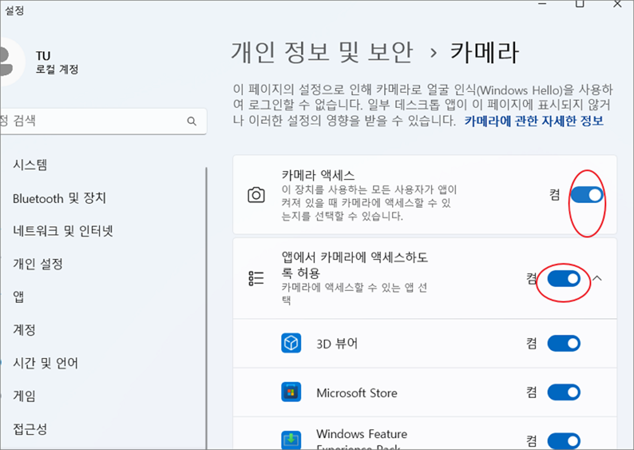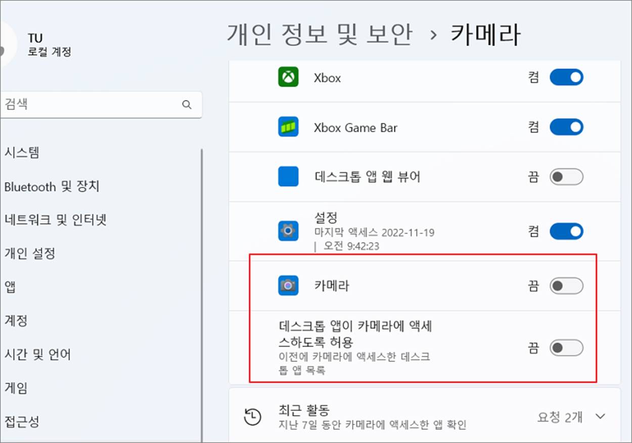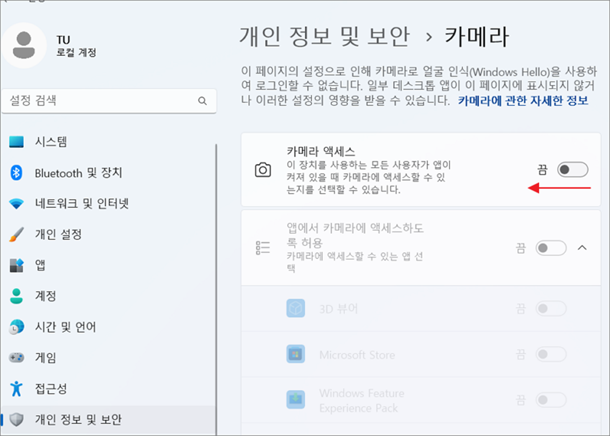 ▼ 카메라 개인 정보 및 보안 페이지에서 제일 상단에 카메라 액세스를 끄면 장치에 접근을 하지 못합니다. 바로 아래 앱에서 카메라에 액세스하도록 허용 도 끕니다.