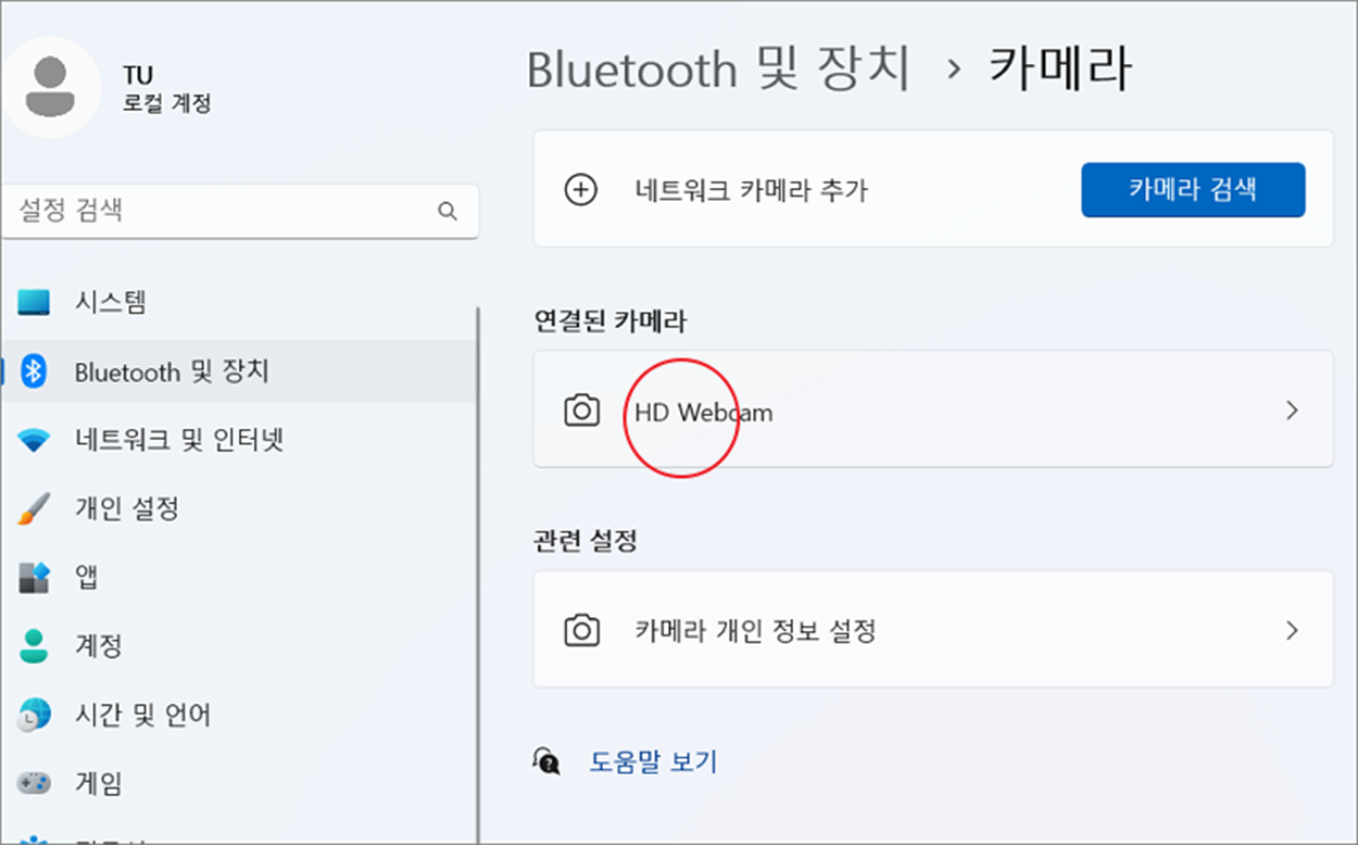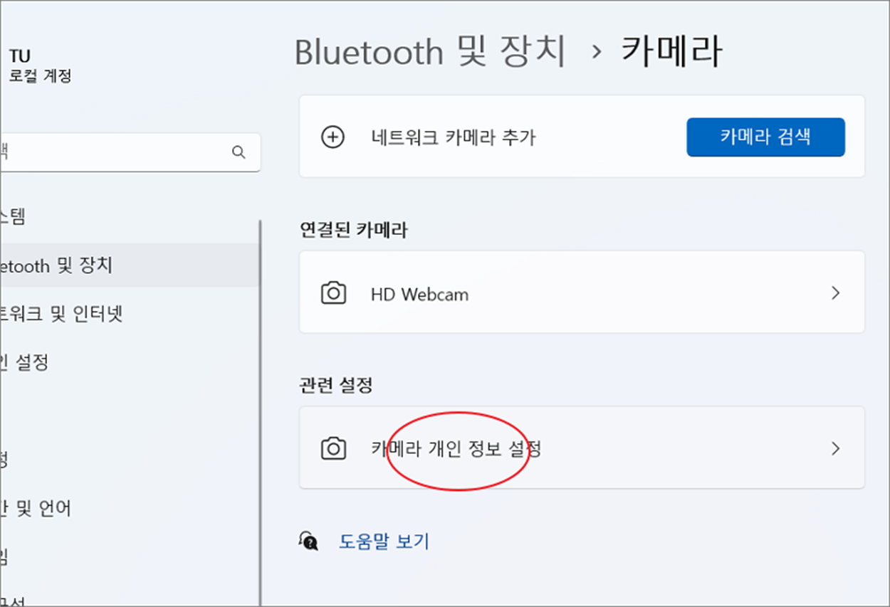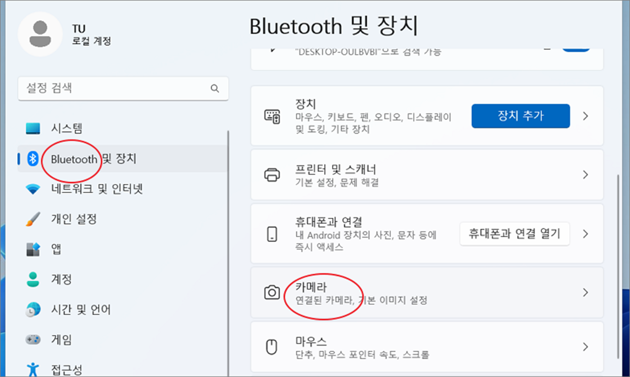 ▼ 다음 왼쪽 사이드에 “블루투스 및 장치” 를 선택합니다. 그리고 오른쪽 화면으로 가서 “카메라” 메뉴를 클릭합니다.