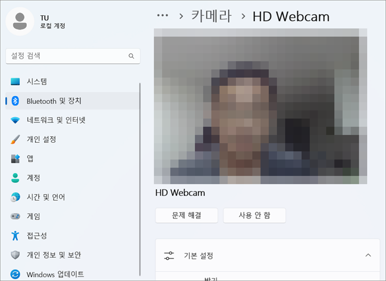 ▼ 노트북이라면 “카메라” > “연결된 카메라” 항목에 Webcam 이 있을 겁니다. 기본 노트북에 내장되어 있는 카메라가 나타나기 때문입니다. 카메라를 클릭해서 상세 설정 페이지로 이동합니다.