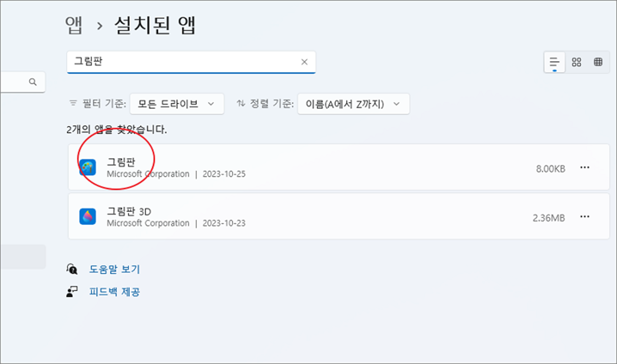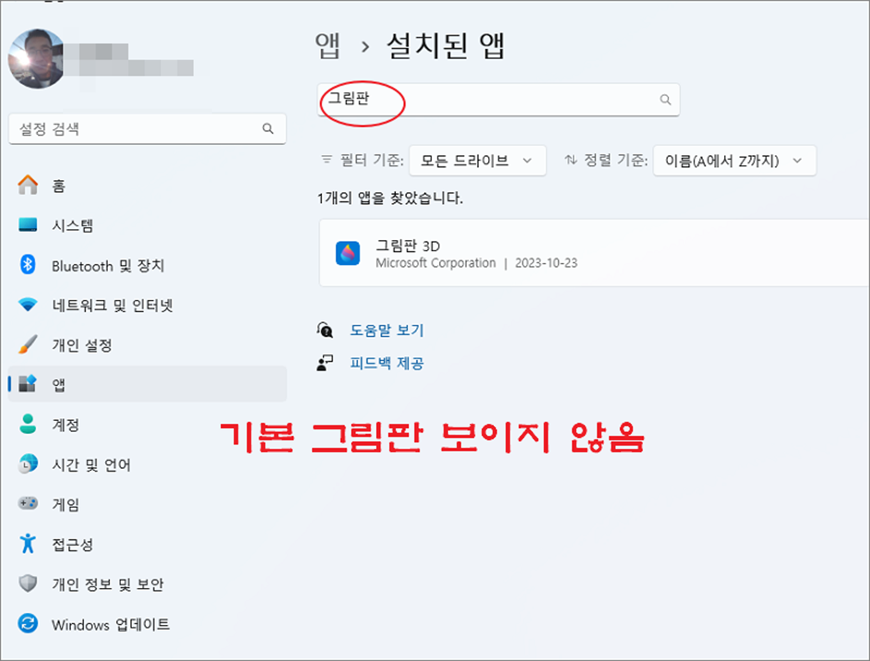 ▼ 스토어에서 그림판을 다운받아 설치한 결과 “설치된 앱” 에서 찾을 수 있습니다.