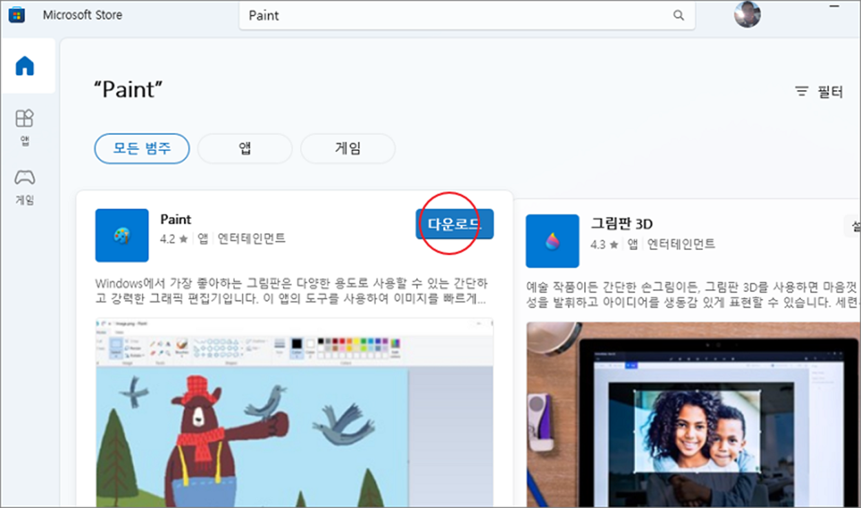▼ 검색 결과에서 Paint 앱이 보이면 다운로드 버튼을 눌러 설치를 진행합니다.