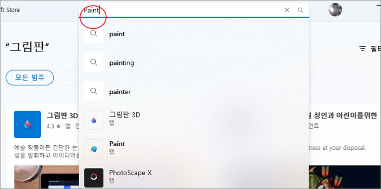▼ 스토어에서 검색 기능을 이용해 그림판을 찾습니다. 기본 그림판은 Paint 로 검색해야 나옵니다.