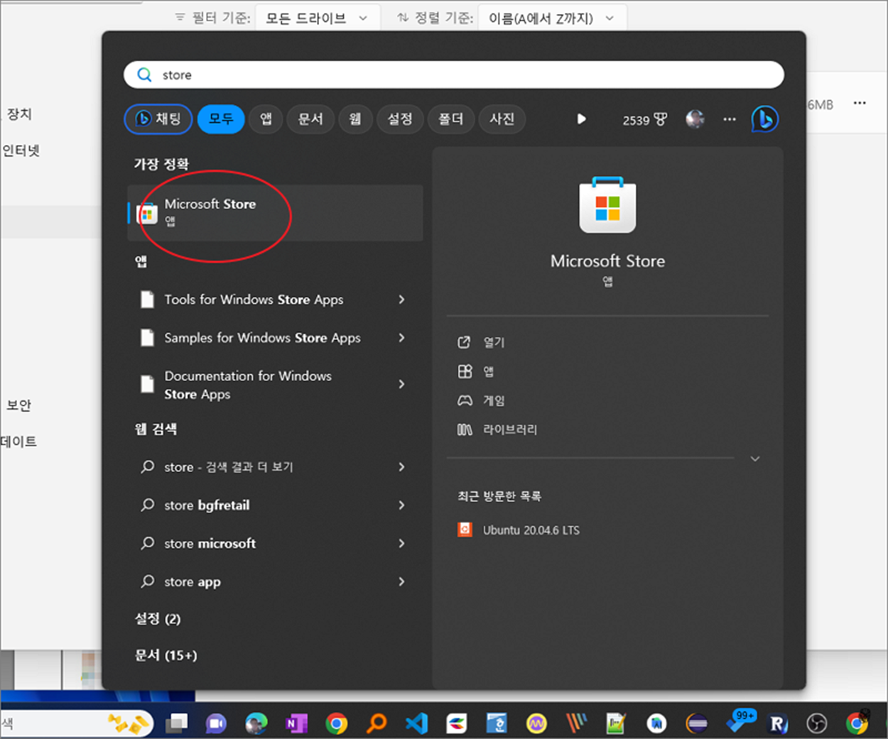 ▼ 그림판이 보이지 않는다면 마이크로소프트 스토어에서 설치가 가능합니다. 검색으로 마이크로소프트 스토어를 찾아 실행합니다.