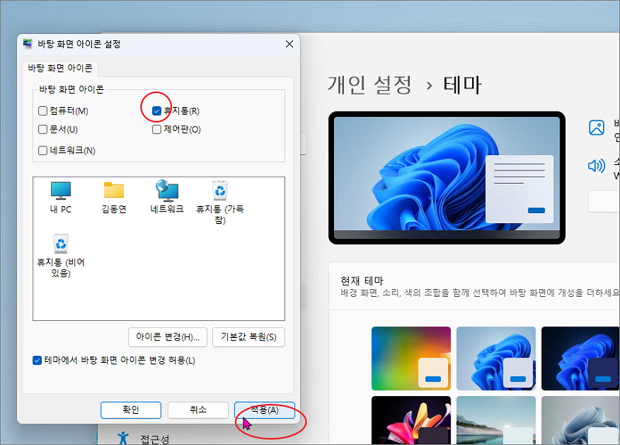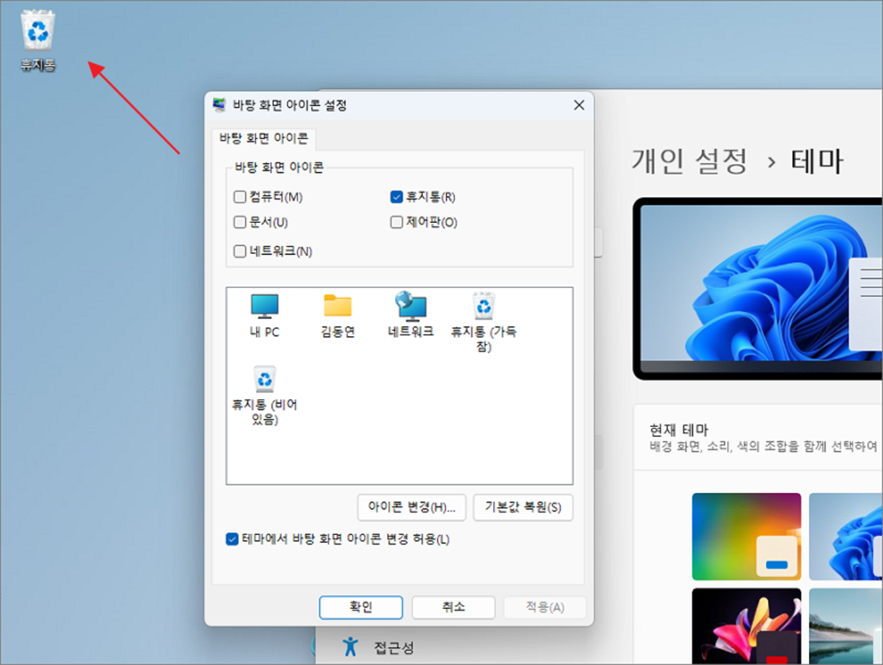 ▼ 그림처럼 바탕화면에 체크한 “휴지통” 아이콘이 나타났습니다. 휴지통 뿐만 아니라 다른 아이콘도 체크해 보았습니다.