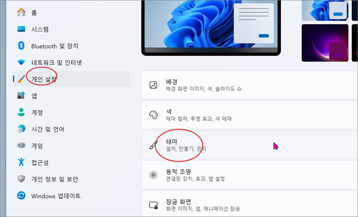 ▼ “개인 설정” 화면에서 “테마” 항목을 찾아 상세 설정으로 이동합니다.