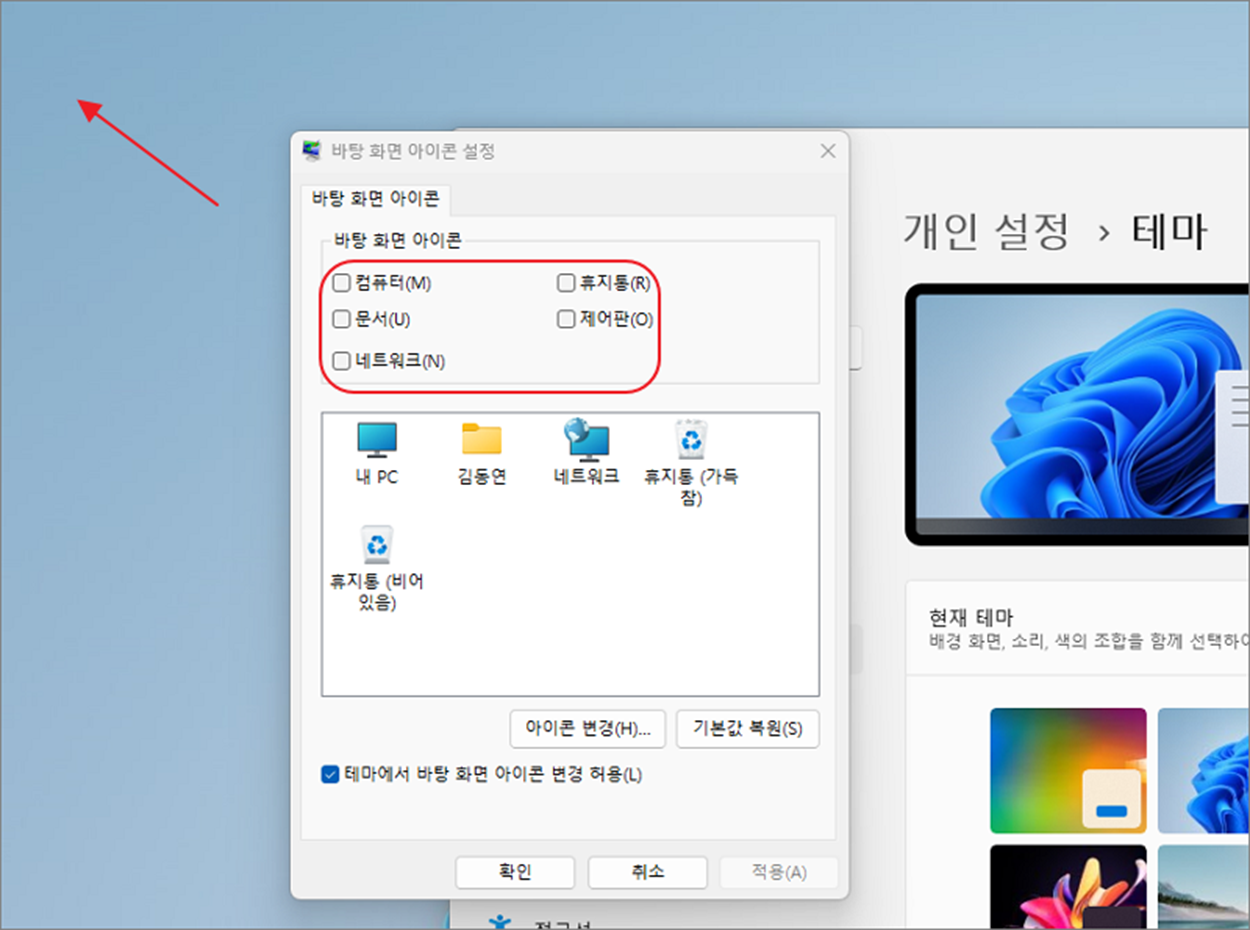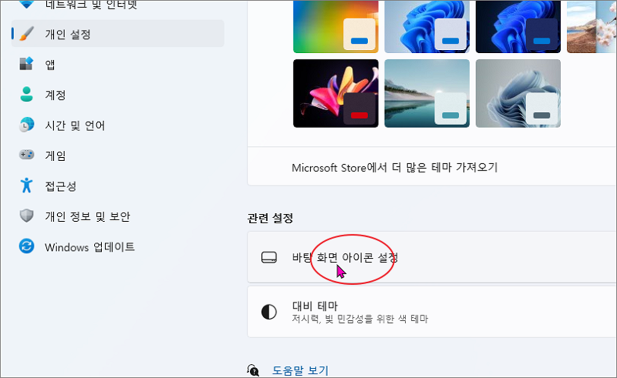 ▼ “테마” 설정 화면에서 아래로 내려가시면 “바탕 화면 아이콘 설정” 을 볼 수 있습니다. 클릭해서 설정창을 띄웁니다.