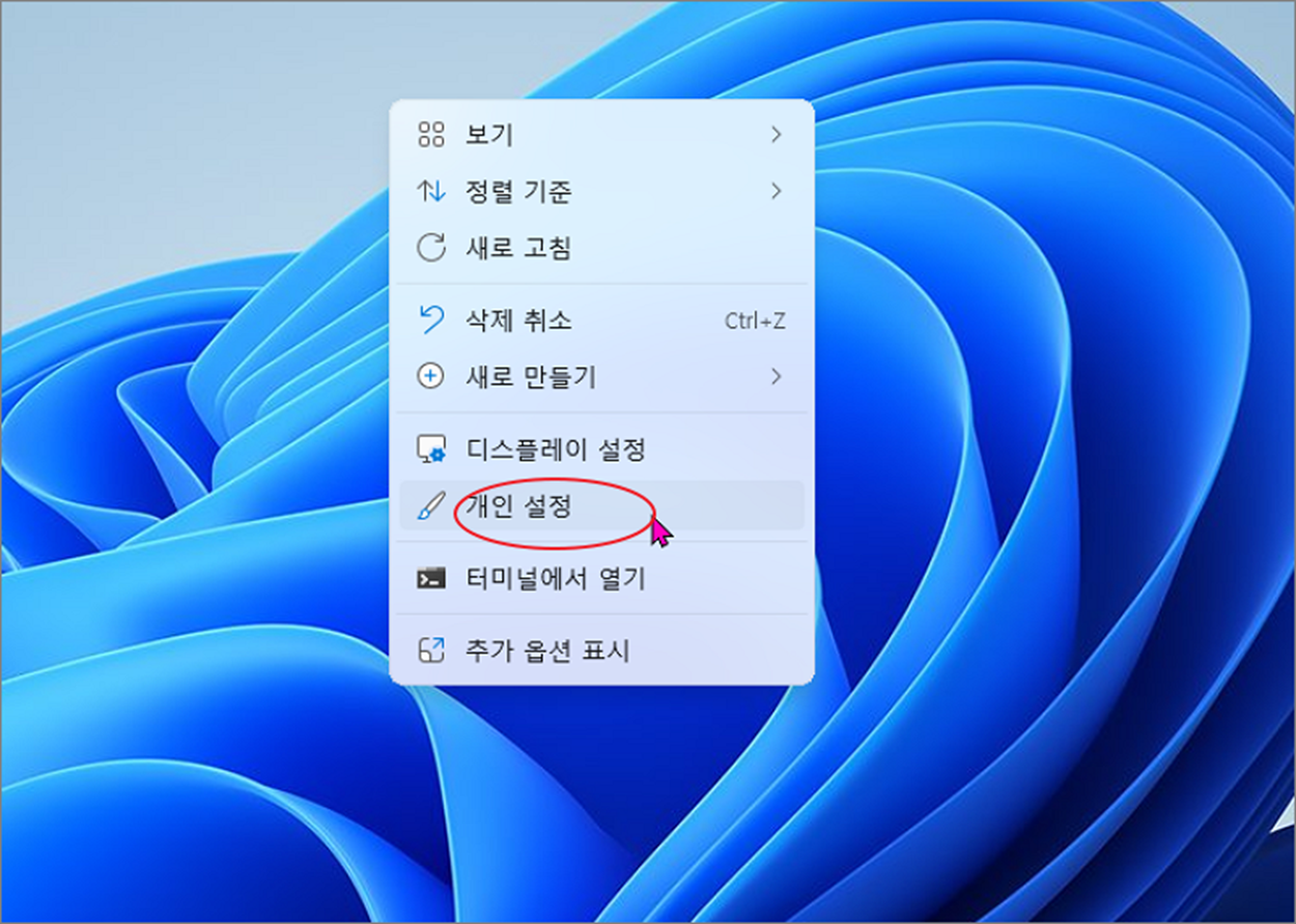 ▼ 휴지통 아이콘을 추가하기 위해 오른쪽 마우스 > 개인 설정 메뉴를 클릭합니다.