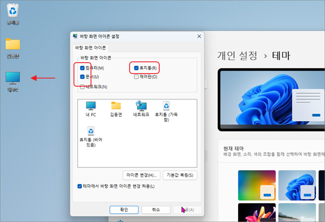 ▼ 컴퓨터에서 제공하는 기본 아이콘인 “컴퓨터”, “문서” 등도 화면에 나타났습니다.