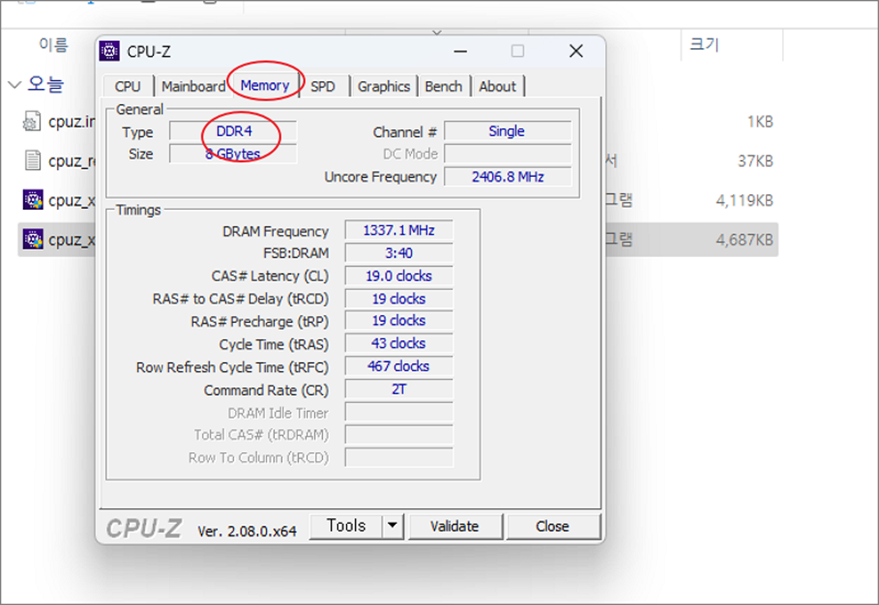 ▼ 프로그램 상단 탭에서 Memory 로 가시면 Type 항목에 DDR4 라는 것을 알 수 있습니다. 그 외 각종 메모리에 대한 정보를 한 눈에 확인할 수 있습니다. 이것으로 메모리 타입의 종류를 확인하고 주문할 쇼핑몰에서 타입에 맞는 메모리를 골라 주문해 보시기 바랍니다.